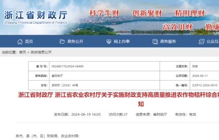 各市、縣(市、區)財政局、農業農村局: 為全面貫徹落實《浙江省人民政府辦公廳關于高質量推進農作物秸稈綜合利用的實施意見》(浙政辦發〔202...