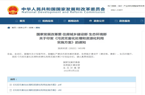 2022927日,國家發改委、住建部、生態環境部聯合印發《污泥無害化處理和資源化利用實施方案》