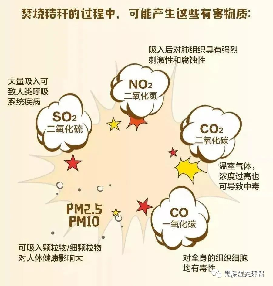 焚燒荒草、秸稈時,大氣中二氧化硫、二氧化氮、可吸入顆粒物三項污染物含量將嚴重增高,其中二氧化硫的濃度比平時高出1倍左右,二氧化氮、可吸入顆粒物的濃度比平時高出3倍左右,相當于日均濃度的五級(重度污染)水平。當可吸入顆粒物濃度達到一定程度時,對人的眼睛、鼻子和咽喉含有黏膜的部分刺激增大,輕則造成咳嗽、胸悶、流淚,嚴重可能導致支氣管炎發生。