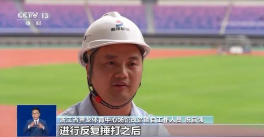 浙江省黃龍體育中心場館改造項目工作人員 祝自強:現場我們是配備了兩臺破碎機,它是通過機器里面的板錘進行反復捶打之后,通過五個粒徑不同的口出來,一個是05毫米,再一個是510毫米,再一個是1030毫米,3050毫米,50毫米以上,總共是五種粒徑,它有不同的用處。