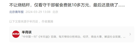 這一消息也引發(fā)了媒體的廣泛關(guān)注。北京青年報就以《不讓燒秸稈,僅看守干部餐食費就10多萬元,最后還是燒了……》為題轉(zhuǎn)載了這篇文章。