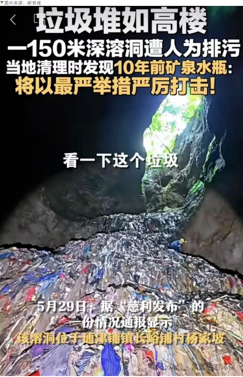 在網(wǎng)友拍攝的視頻中,溶洞中的垃圾堆了七八層樓高,多處鐘乳石被污水染黑,生活垃圾與畜禽糞水混合在一起,有些包裝甚至能看到十年前的產(chǎn)期標志,畫面觸目驚心。