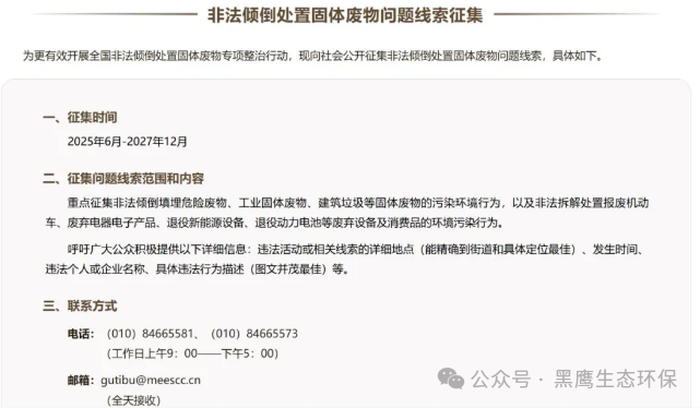 同時,生態(tài)環(huán)境部也歡迎社會各界及媒體朋友積極提供問題線索,并在門戶網(wǎng)站開設了非法傾倒處置固體廢物線索征集專欄,公開了舉報電話及郵箱。